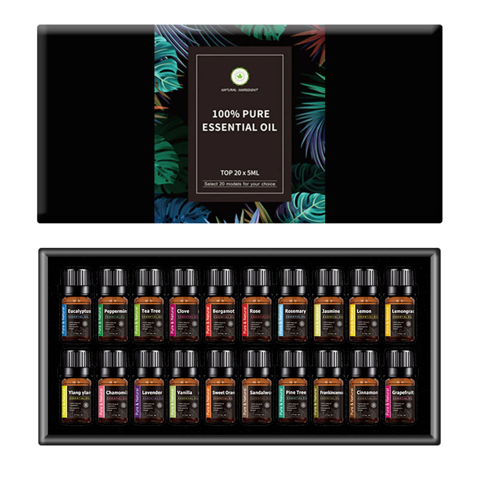1. The gift set includes 20 bottles of 5 ml aromatherapy essential oils: eucalyptus, peppermint, tea tree, clove, bergamot, rose, rosemary, jasmine, lemon, lemongrass, cananga odorata, chamomile, lavender, vanilla, sweet orange, sandalwood, pine, grapefruit, mastic and grapefruit. This set can improve mental acuity, promote and happiness, easy to mix and match for the purpose of fusion or dilution.