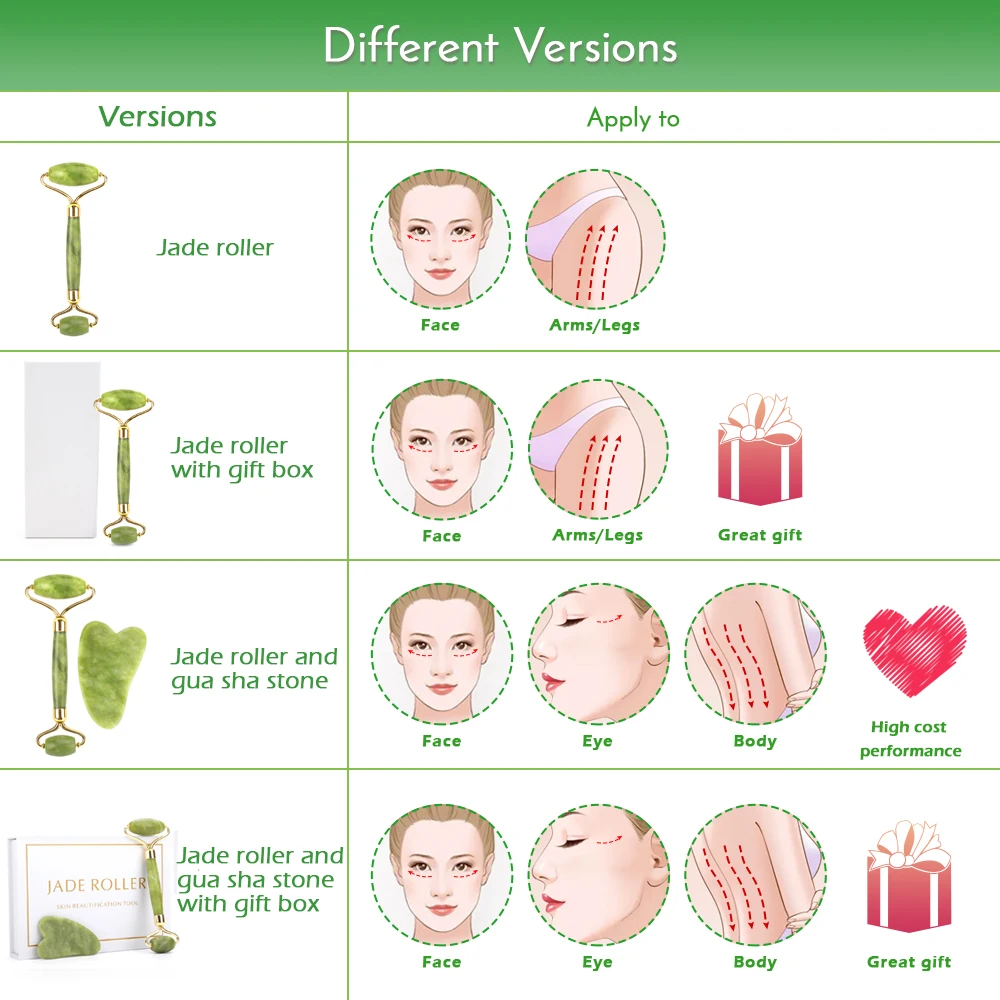 The light and dark green rollers are classics. The rose quartz features floral handles for added delicate beauty.
