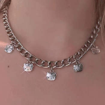 Y2k Hello Kitty Necklace With Chain Alloy Silver Crystals Female Charms Rhinestone Goth Pendant Jewelry Valentine Day Gift