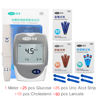 ① Meter and 3 in 1 test strips=1 Blood glucose meter +1 Lancing pen +25 pcs glucose strips +10 pcs cholesterol strips+25pcs uric acid strips+60pcs needles