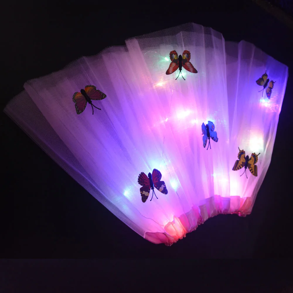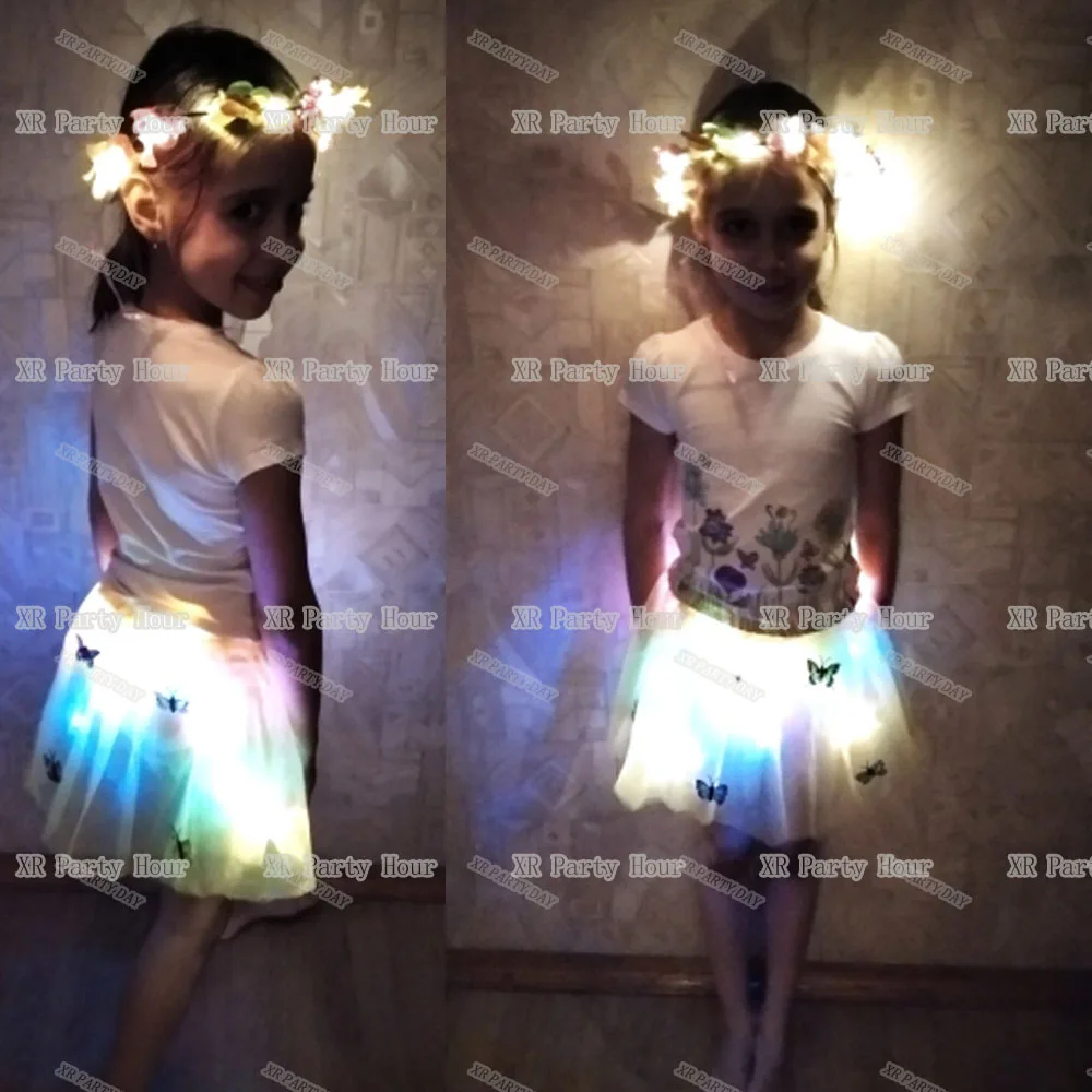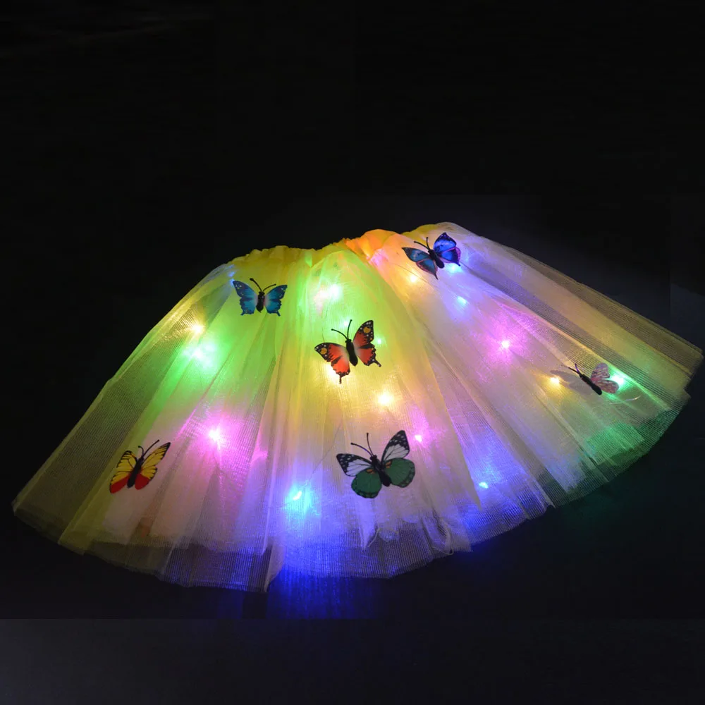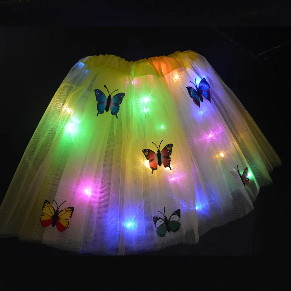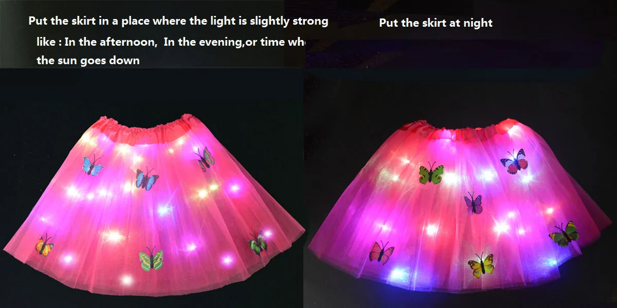 Powered by 2 x button batteries (included and replacement) . Light mode: Burn on . Each skirt has 12 butterfly on it. 3-layers skirt.
