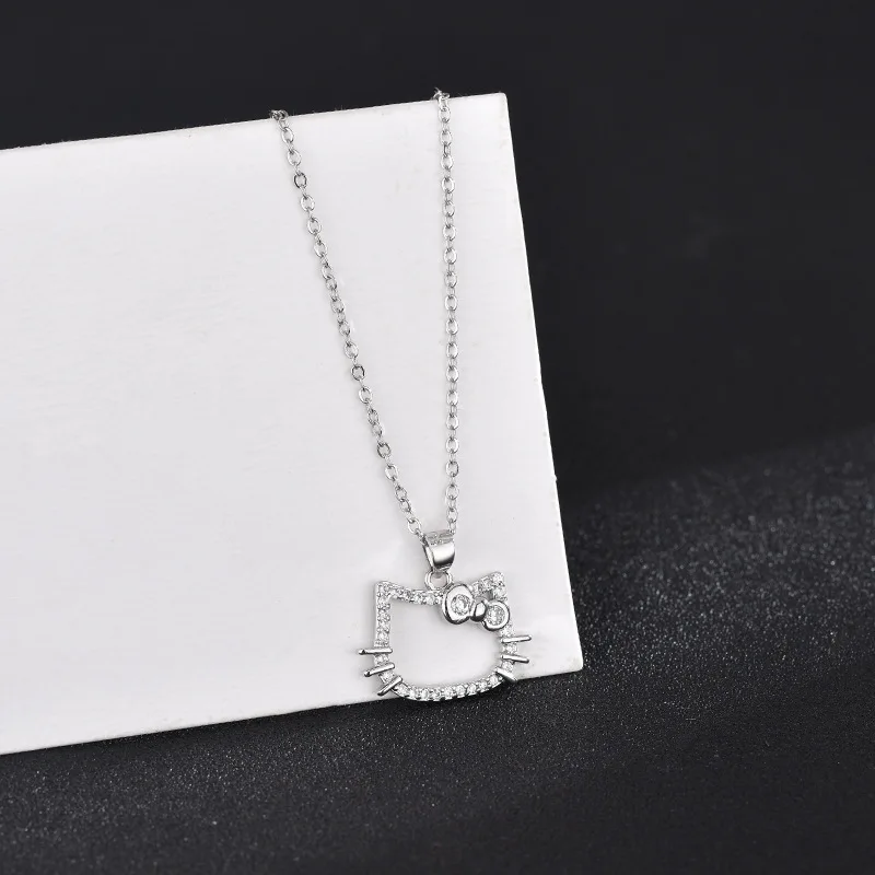Hello Kitty S925 Silver Bow Necklace Cute Cartoon KT Cat Crystal Clavicle Chain Live Ring Fashion Personality Jewelry Girl Gift