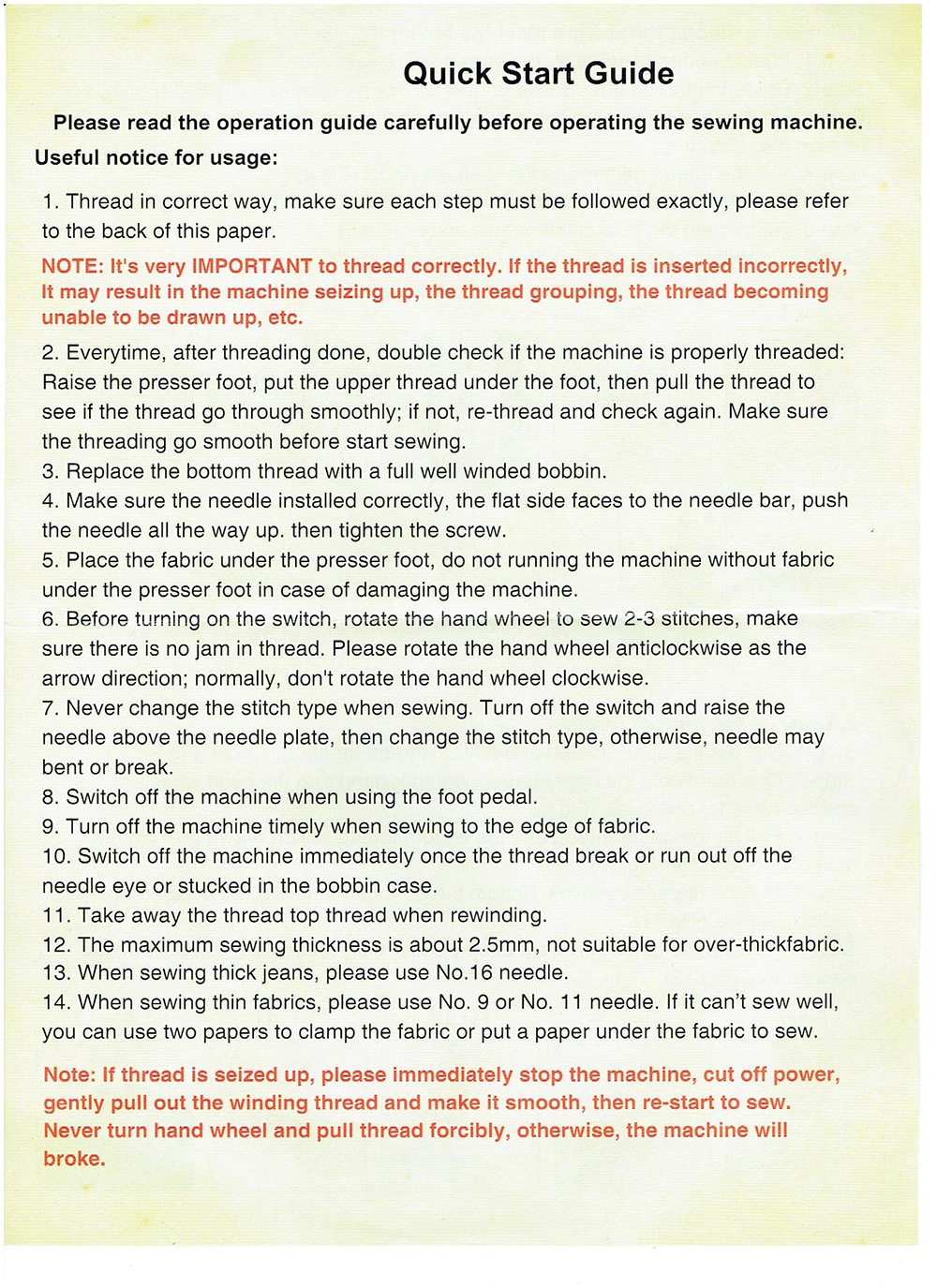If you are an experienced tailor, 1. Please turn the handwheel three times before starting the work to ensure that the machine works smoothly, and then connect adapter to work. 2. Please thread the upper thread according to the instructions or the video. The steps must not be less and the direction cannot be wrong. 3. The bobbin of the lower thread must be metal, the plastic bobbin cannot be used. 4. If the sewing machine works abnormally, turn off the machine immediately, otherwise it will damage the inside of the machine. If you have any questions, please contact the online customer service in time, we have professional technical staff to help you solve a problem,