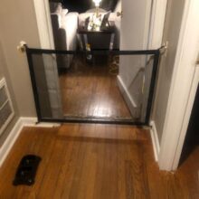 Holy smokes, this gate is awesome. It was so easy to stick the little hooks up and boom!.. it’s up. Looks great and won’t leave marks on my walls like my old wooden gate. Plus it came with extra hooks.
