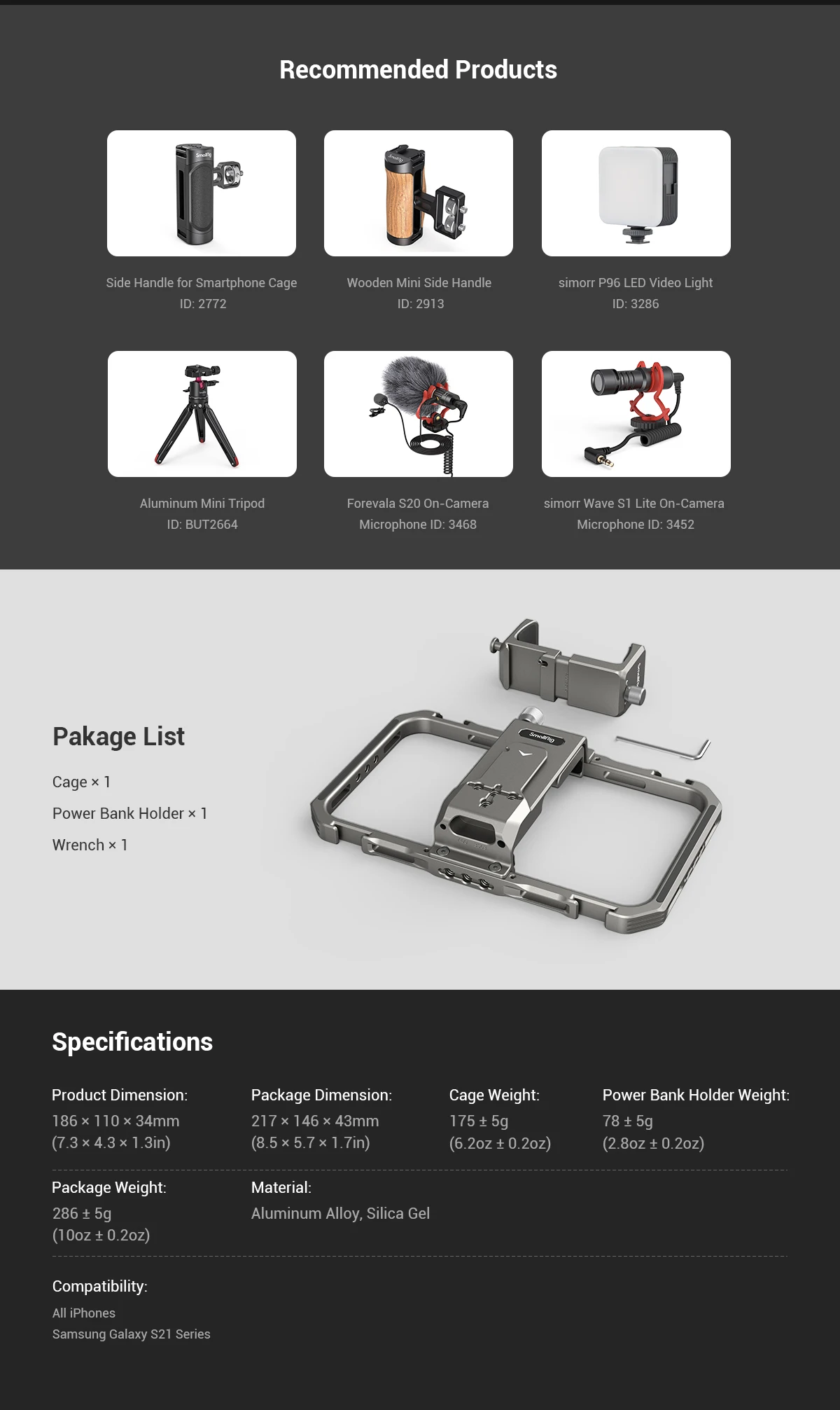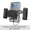 SmallRig Universal Lite Video Kit for iPhone Series 3611 is a compact, multifunctional kit designed for professional videography, live streaming and vlogging. Comes with 1/4″-20 anti-twist threaded holes and cold shoes support accessories as Side Handle 2772, Tripod BUT2429, Microphone 3452 and LED Light 3286; Its back comes with a magnetic quick-release design to firmly attach a power bank holder, providing a complete power supply solution for mobile phone filming. The smartphone holder can be moved left and right for fine adjustment to avoid blocking buttons, the split-level design does not affect mobile phone signal, and its built-in shims help increase stability and prevent scratches. The phone allows horizontal and vertical shooting after mounting on the cage.
