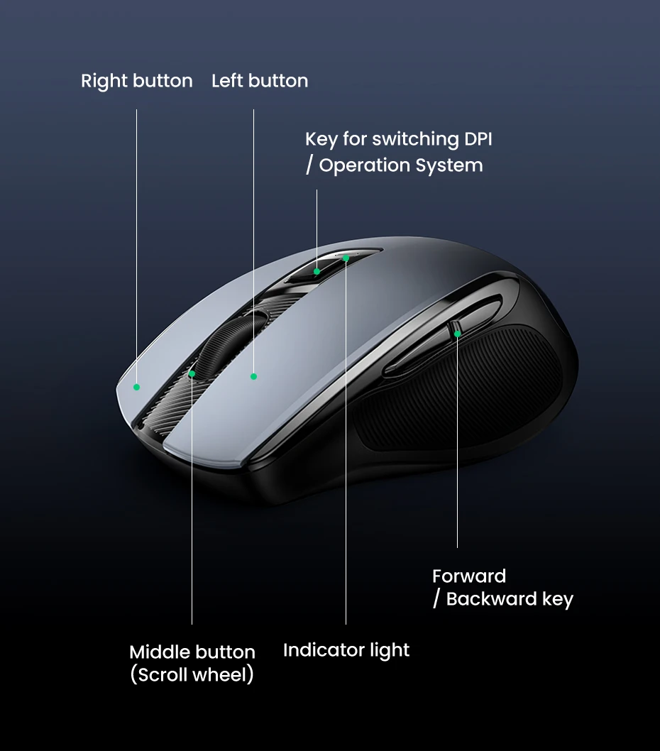 Indicator light, Forward / Backward key, Key for switching DPI/ Operation System