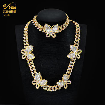 Hip Hop Iced Out Necklace Butterfly Crystal Miami Cuban Chain Gold Silver Color Fashion Necklace Bracelet Set for Mens Women